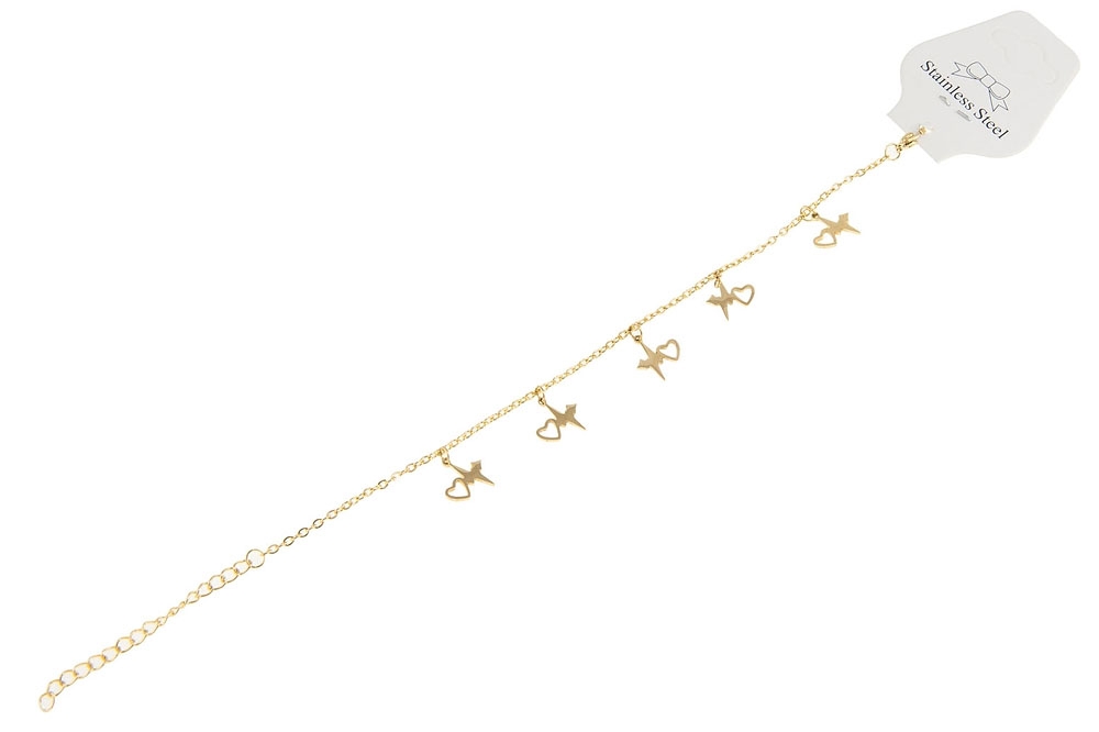 Elegancka złota bransoletka z ozdobnym przywieszkami w kształcie serduszek.