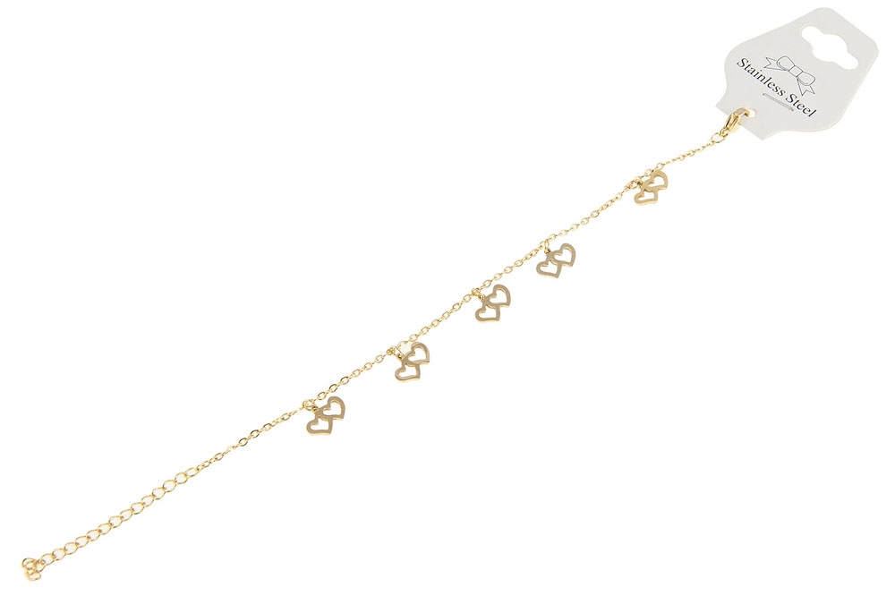 Elegancka złota bransoletka z ozdobnym przywieszkami w kształcie serduszek.