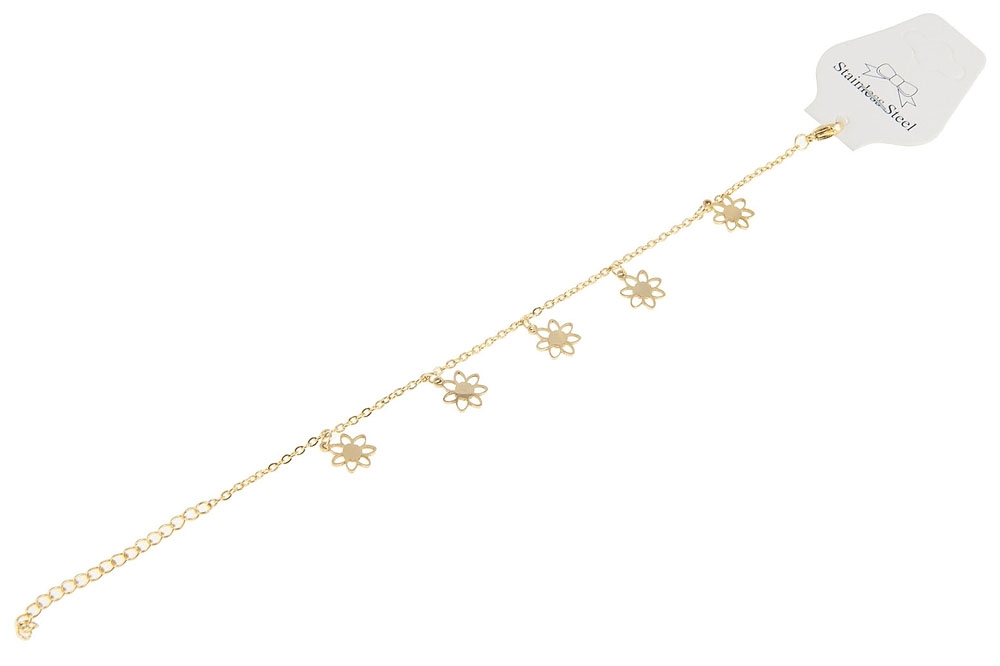Elegancka złota bransoletka z ozdobnym przywieszkami w kształcie kwiatków.