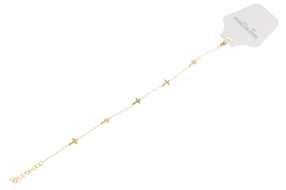 Elegancka złota bransoletka z ozdobnymi elementami w kształcie krzyżyków.