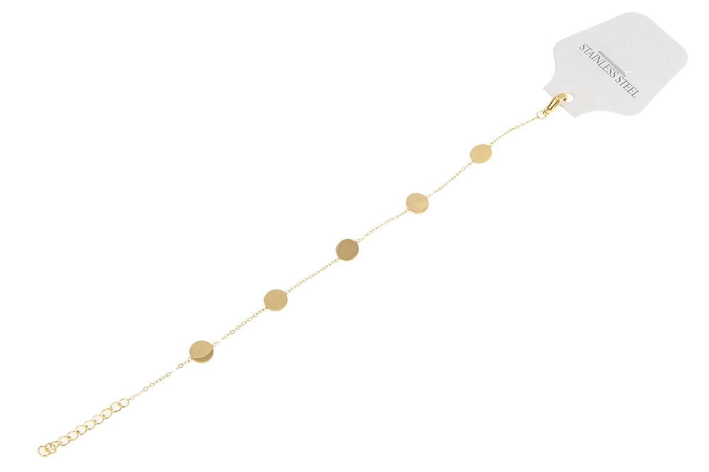Elegancka złota bransoletka z ozdobnymi elementami w kształcie kółek.