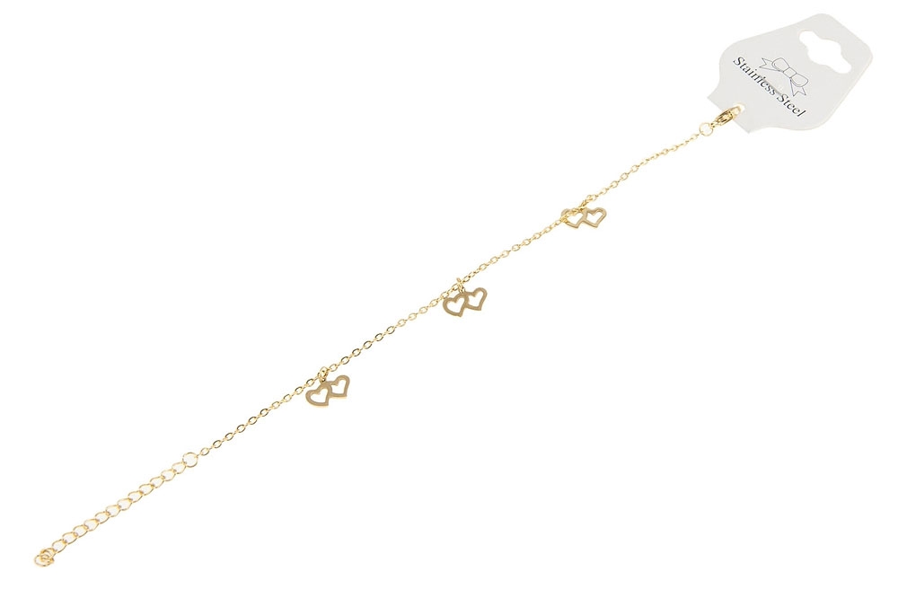 Elegancka złota bransoletka z ozdobnym przywieszkami w kształcie serduszek.