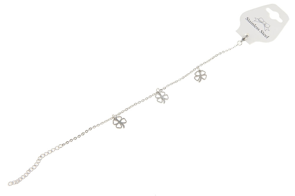 Elegancka srebrna bransoletka z ozdobnym przywieszkami w kształci koniczynek.