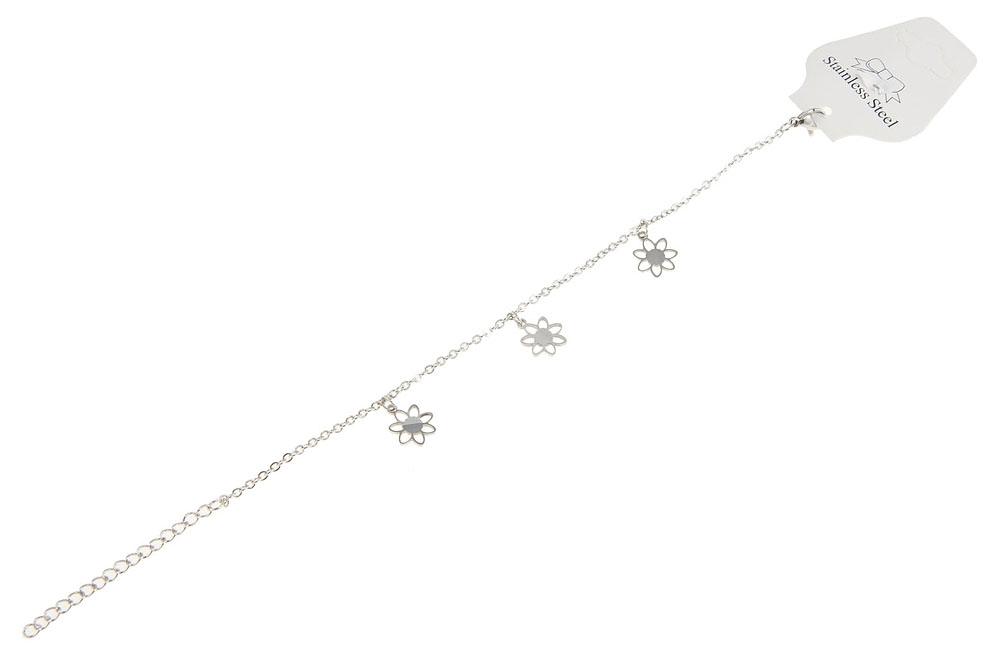 Elegancka srebrna bransoletka z ozdobnym przywieszkami w kształcie kwiatków.