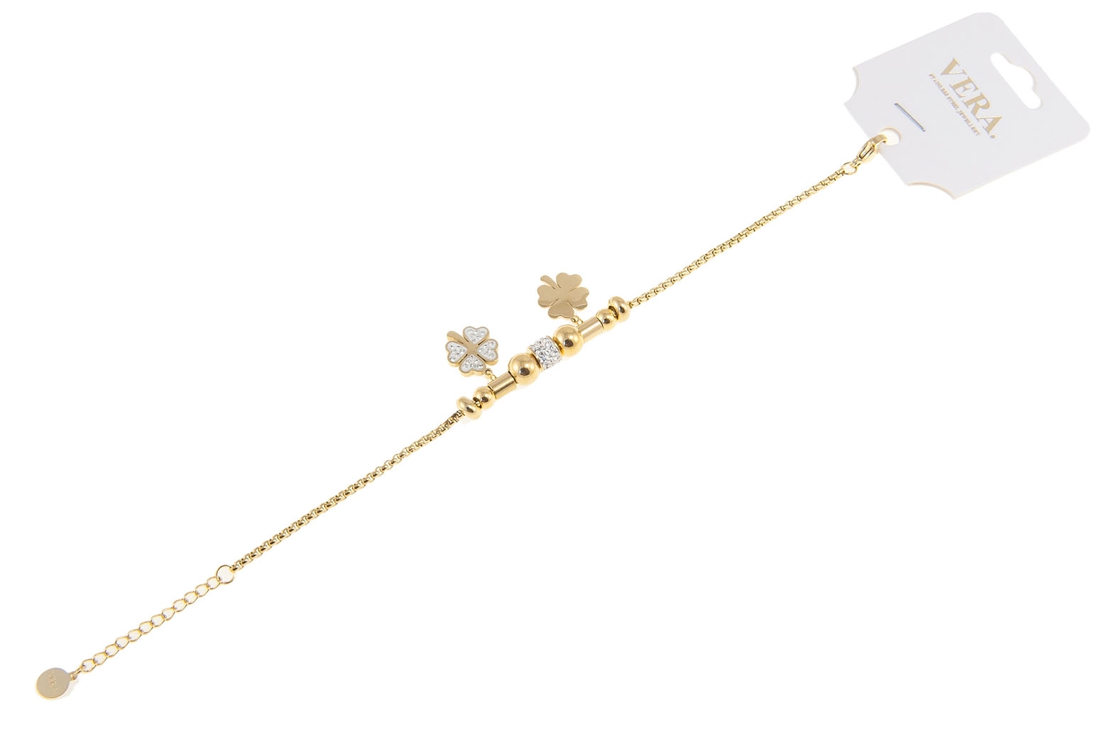 Elegancka, złota bransoletka z ozdobnymi przywieszkami.