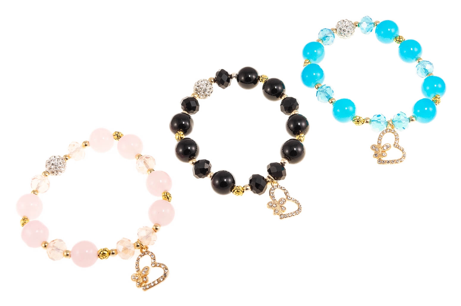 Elegancka bransoletka wykonana z koralików i przywieszki w kształcie serduszka z motylkiem.Zestaw składa się z trzech kolorów: różowy, niebieski i czarny.