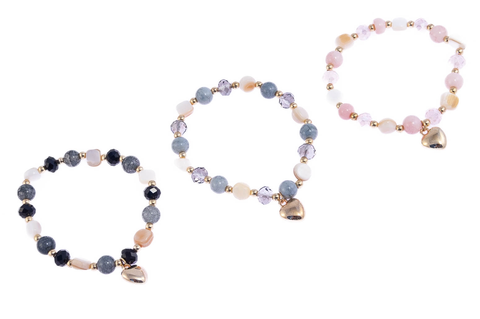Elegancka bransoletka wykonana z koralików i przywieszki w kształcie serduszka.Zestaw składa się z trzech kolorów: czarny, szary i różowy.