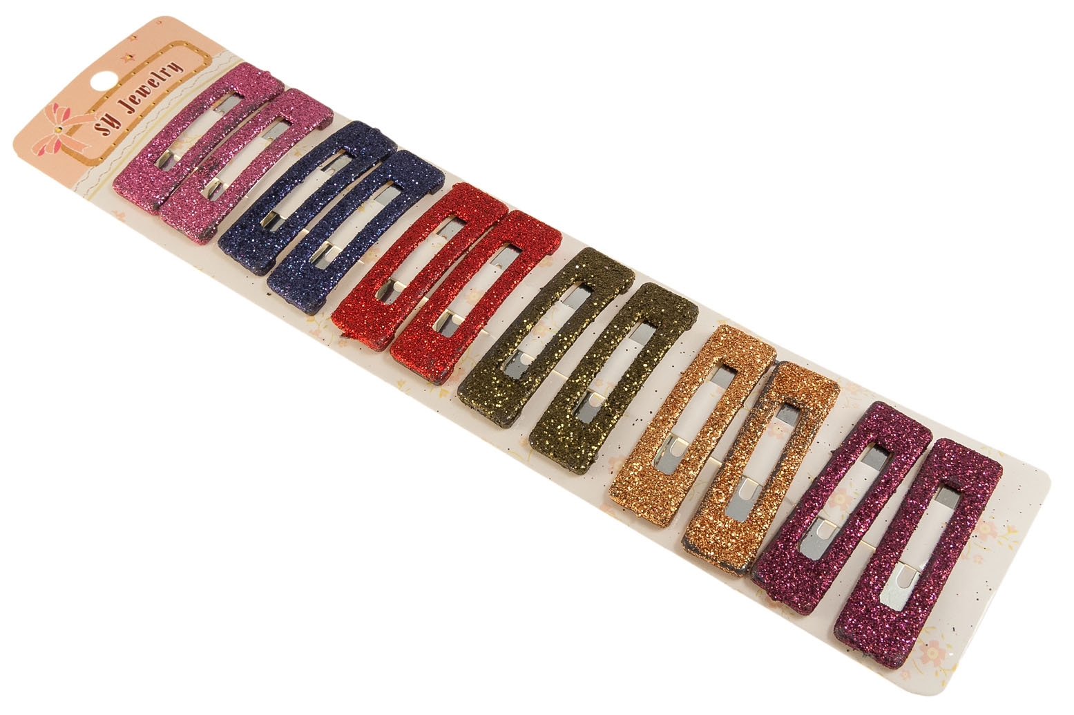 Klasyczne spinki do włosów, wykonane z metalu. Spinki są ozdobiene błyszczącym brokatem.Zestaw składa się z sześciu kolorów: różowy, granatowy, czerwony, zielony, złoty i fioletowy.