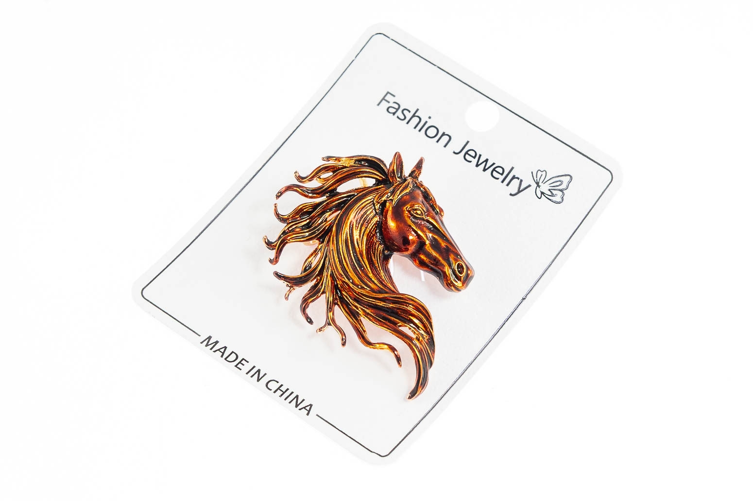 Elegancka broszka w kształcie głowy konia. Przywieszka ozdobiona brązową emalią.Ozdoba doda szyku każdej stylizacji.