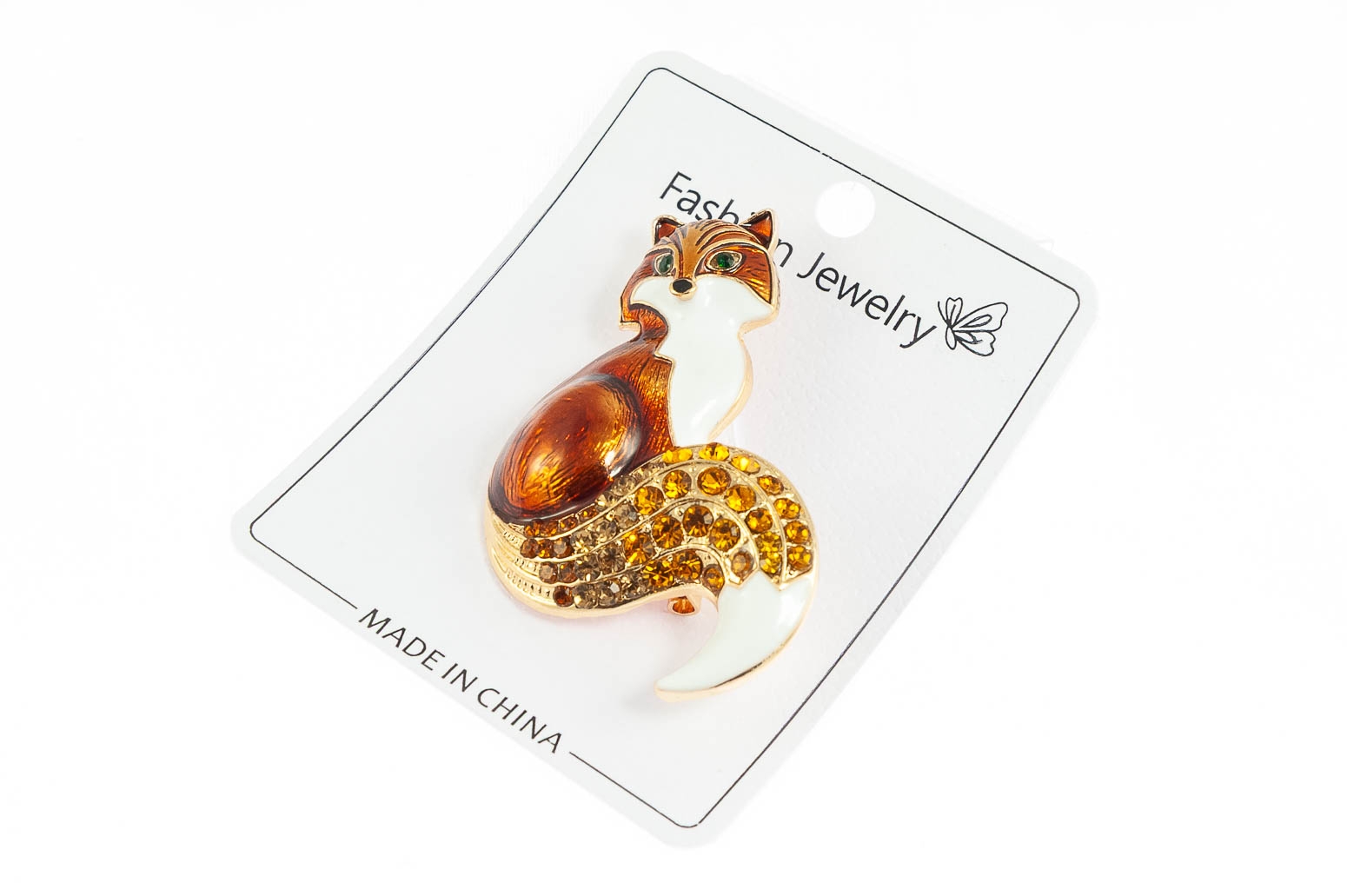 Elegancka broszka w kształcie lisa. Przywieszka w kolorze złotym, ozdobiona szlifowanymi kamieniami i brązową emalią.Ozdoba doda szyku każdej stylizacji.