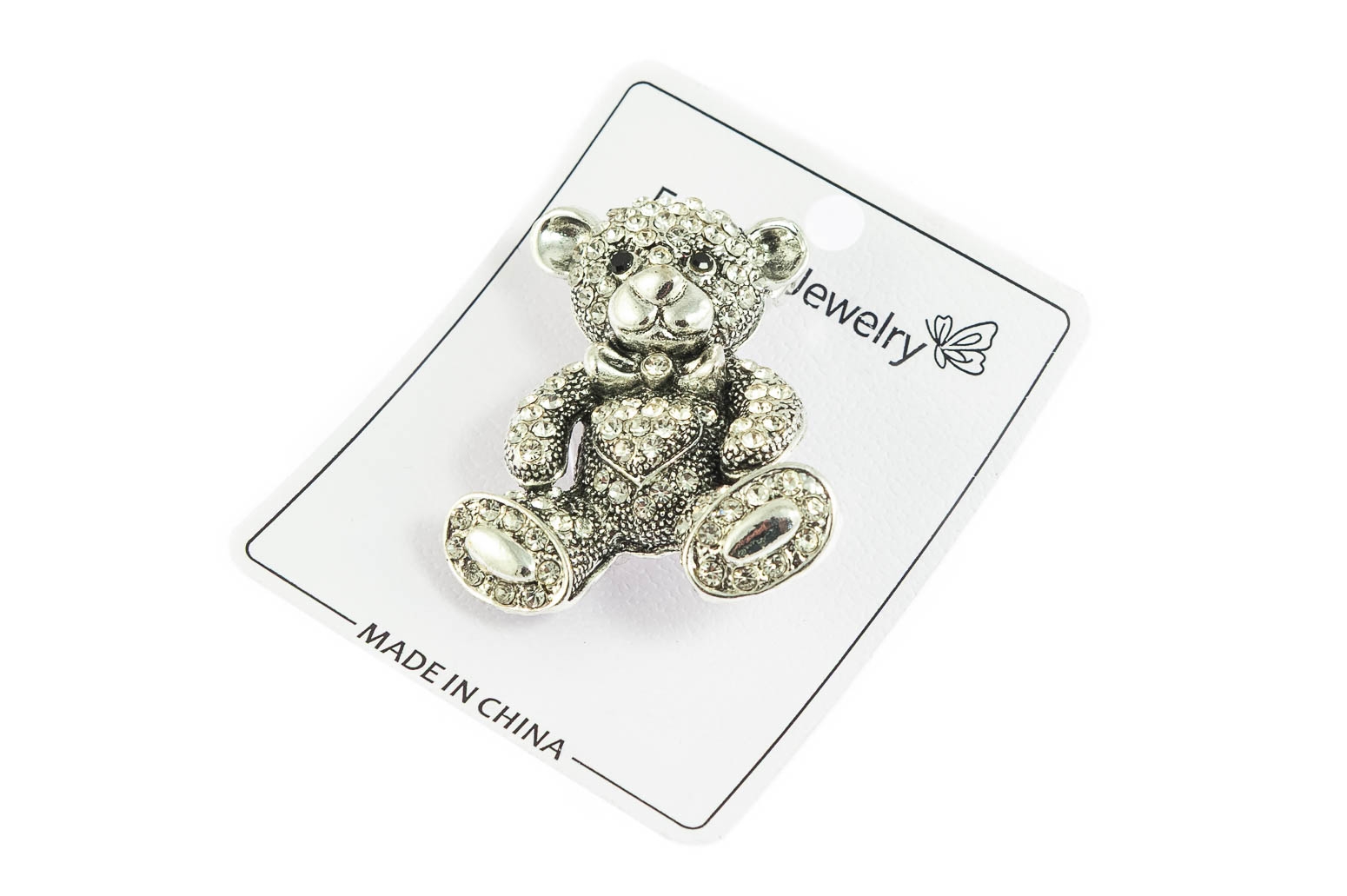 Elegancka broszka w kształcie misia. Przywieszka w kolorze srebrnym, ozdobiona szlifowanymi kamieniami.