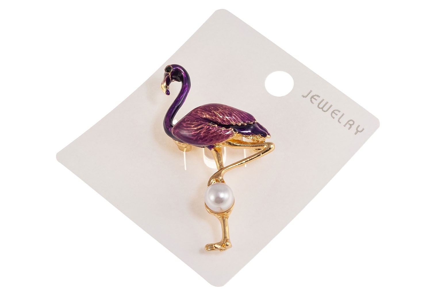Elegancka broszka w kształcie flaminka w kolorze złotym, ozdobiona kolorową emalią i perłą.
