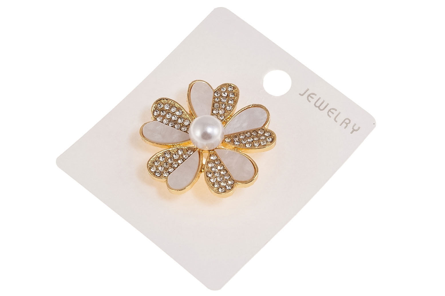 Elegancka broszka w kształcie kwiatka w kolorze złotym, ozdobiona kolorową dżetami i perłą.Broszka doda szyku każdej stylizacji.