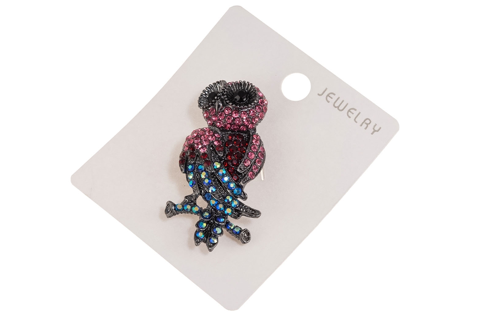 Elegancka broszka w kształcie sowy w kolorze grafitowym, ozdobiona kolorowymi, szlifowanymi kamieniami.Broszka doda szyku każdej stylizacji.