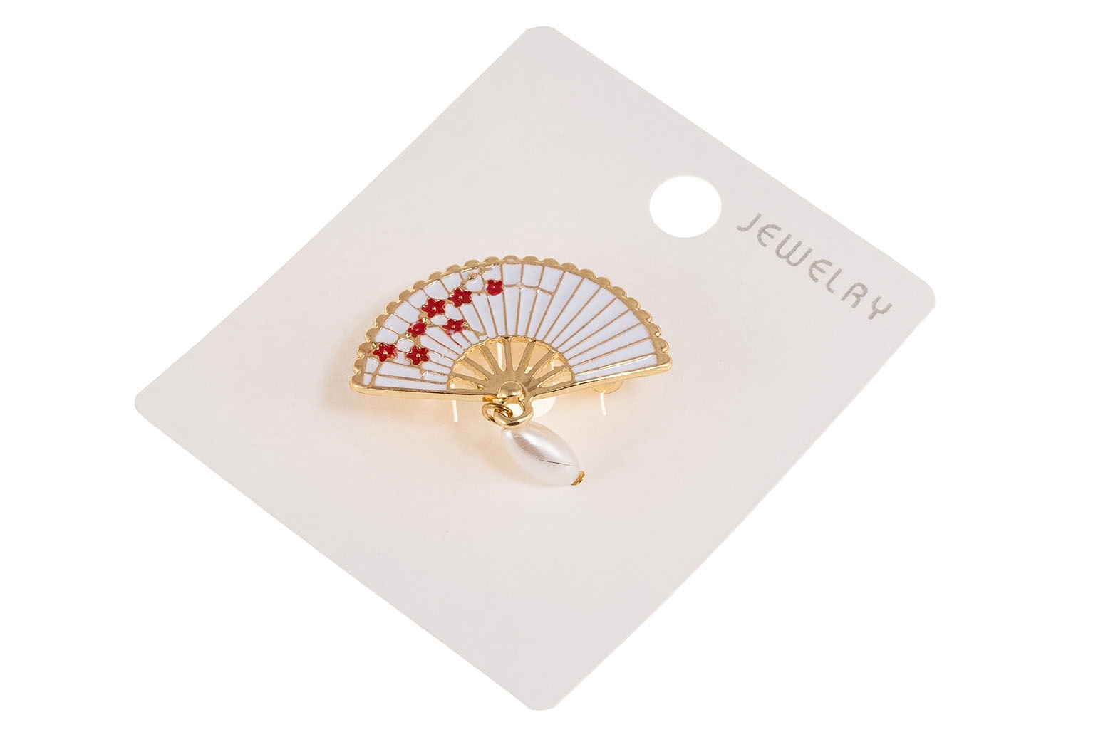 Elegancka broszka w kształcie wachlarza w kolorze złotym, ozdobiona kolorową emalią i perłą.Broszka doda szyku każdej stylizacji.