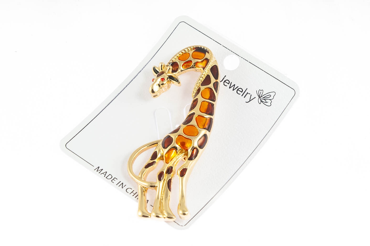 Elegancka broszka w kształcie żyrafy. Przywieszka w kolorze zołotym, ozdobiona szlifowanymi kamieniami i brązową emalią.