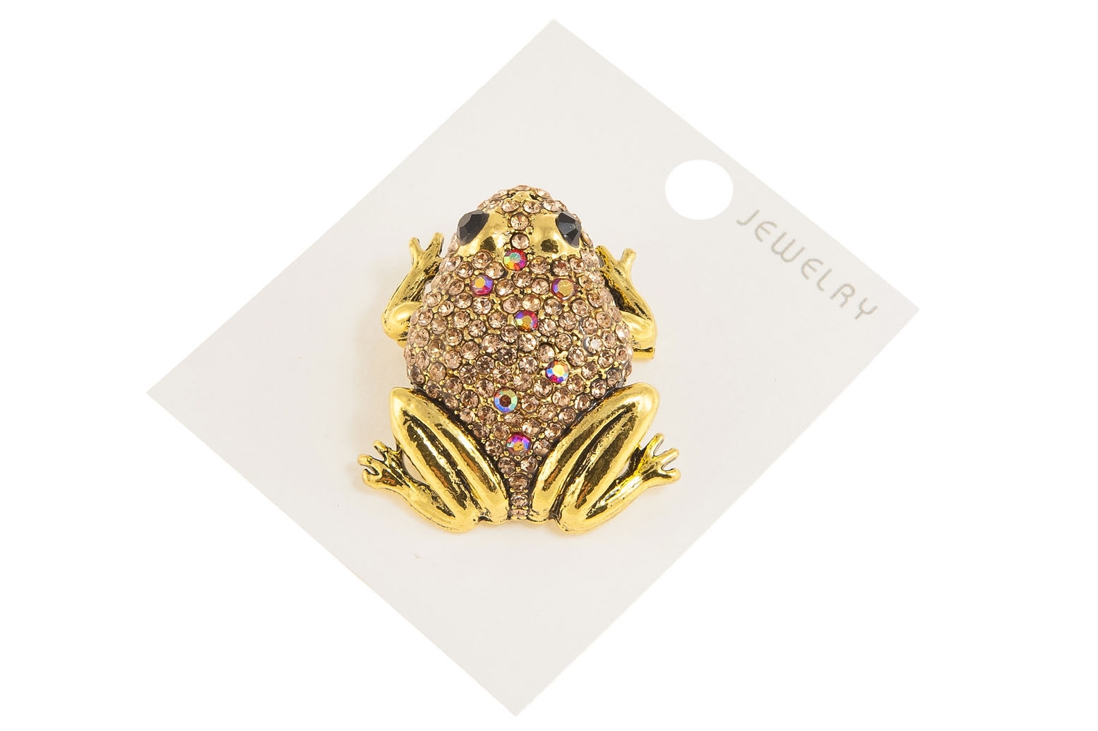 Elegancka broszta w kształcie żaby. Przywieszka w kolorze złotym, ozdobina szlifowanymi kamieniami.