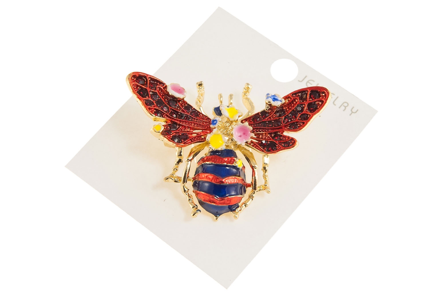 Elegancka broszta w kształcie owada. Przywieszka w kolorze złotym, ozdobina szlifowanymi kamieniami i emalią.Ozdoba doda szyku każdej stylizacji.