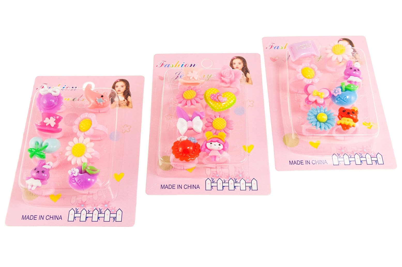 Dziecięce pierścionki w kolorze różowym z uroczymi ozdobami.Pierścionki posiadają regulację średnicy.