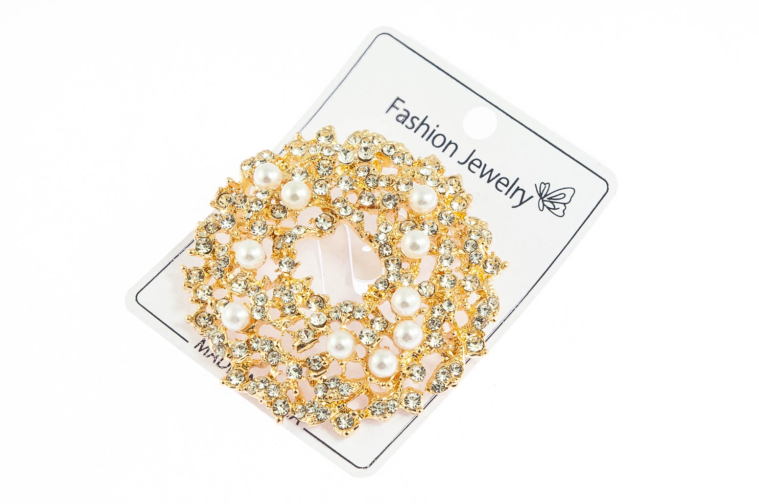 Elegancka broszka w kolorze złotym, ozdobiona szlifowanymi kamieniami i perłami.Ozdoba doda szyku każdej stylizacji.