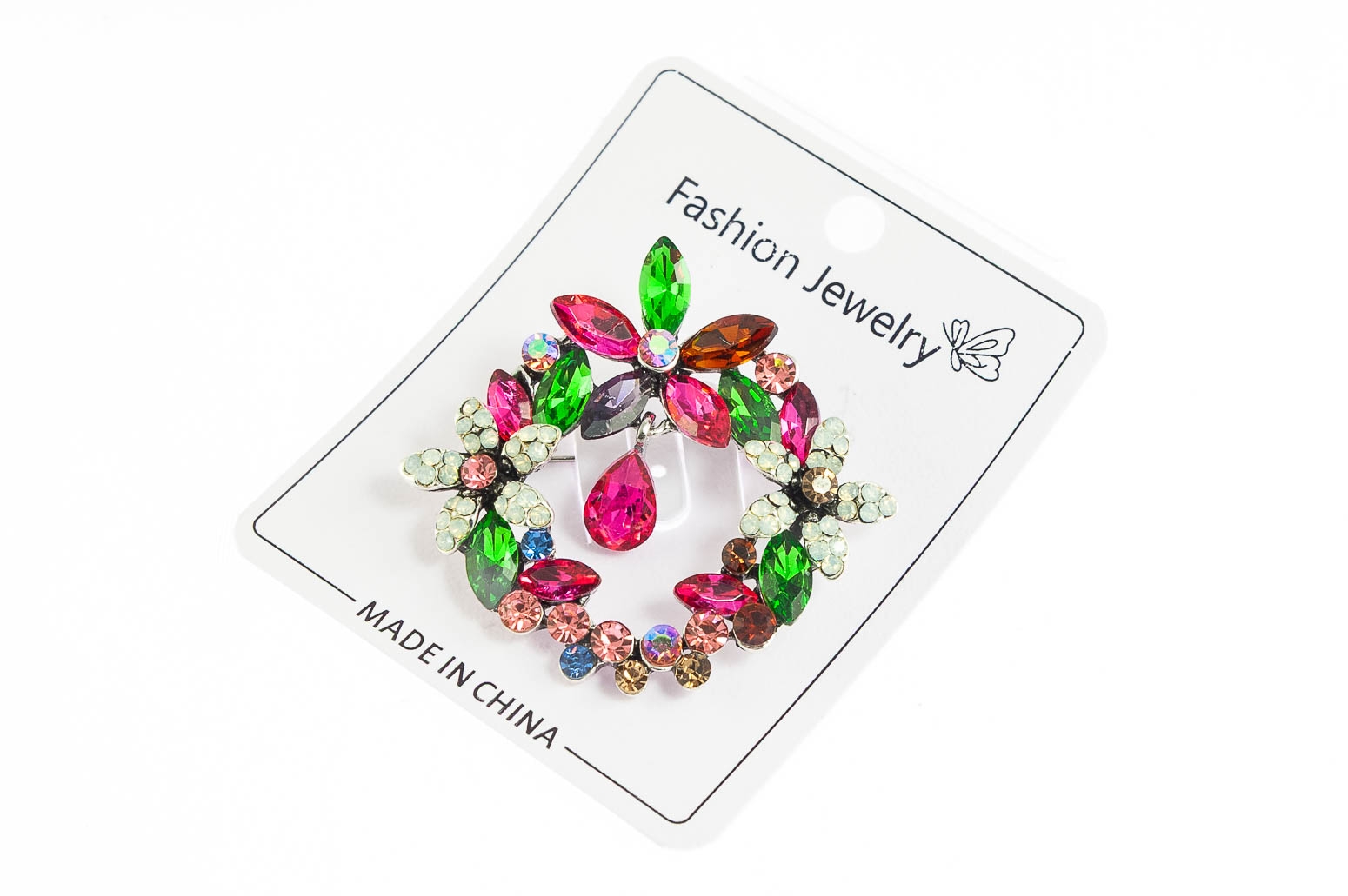 Elegancka broszka w kolorze złotym, ozdobiona kolorowymi, szlifowanymi kamieniami.