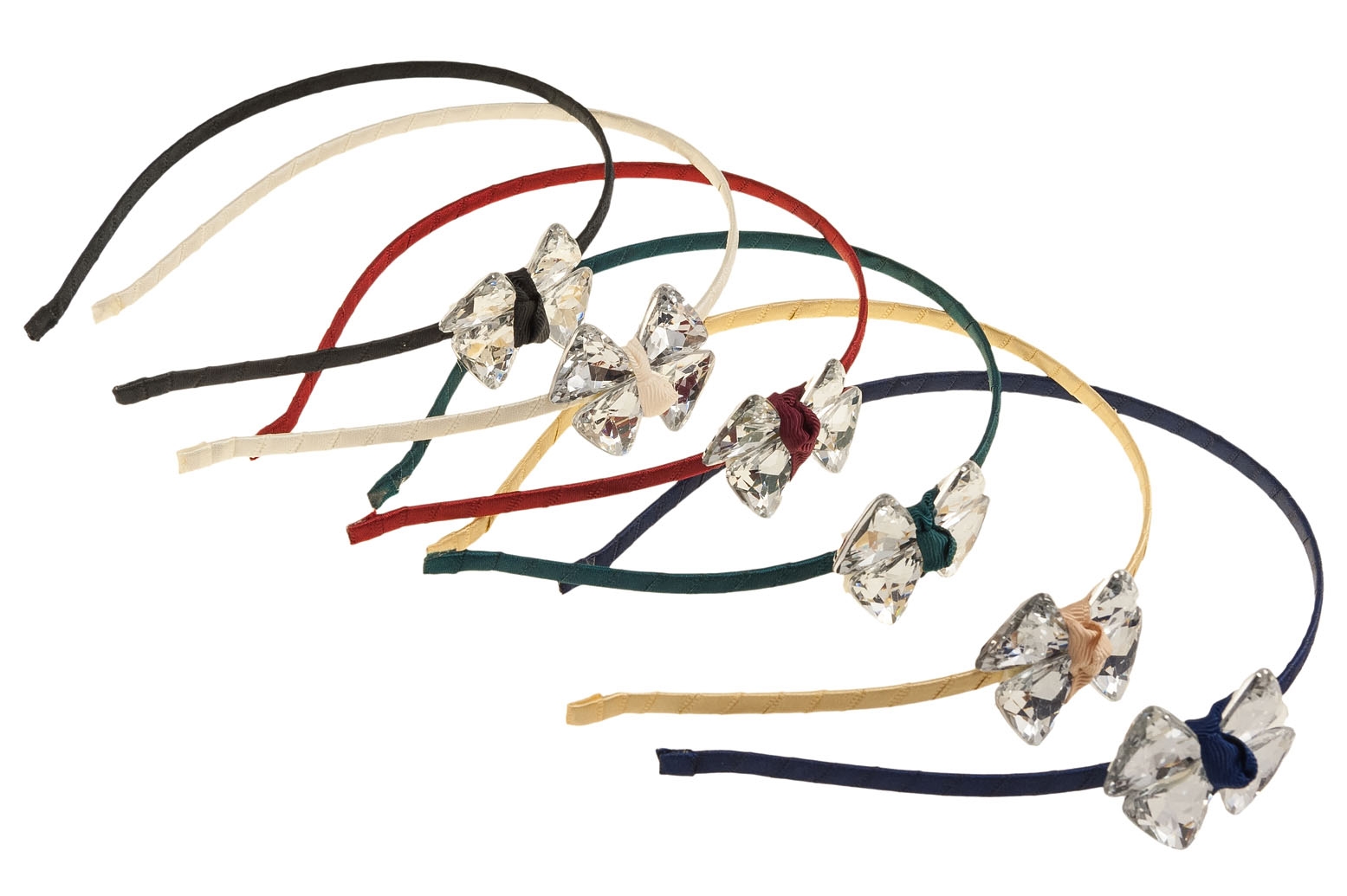 Cienka opaska wykonana z trwałego materiału, ozdobiona kokardą ze szlifowanych kamieni.Zestaw składa się z sześciu kolorów: bordowy, czarny, biały, zielony, beżowy i granatowy.