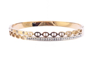 Elegancka srebrno - złota bransoletka, ozdobiona szlifowanymi kamieniami.