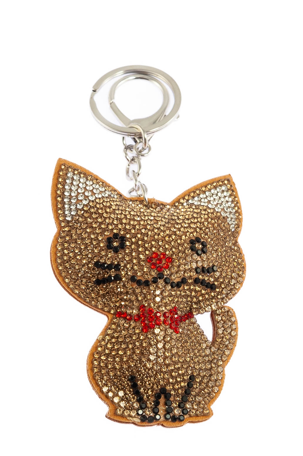 Elegancki brelok w kształcie kotka, ozdobiony dżetami w kolorze beżowym.