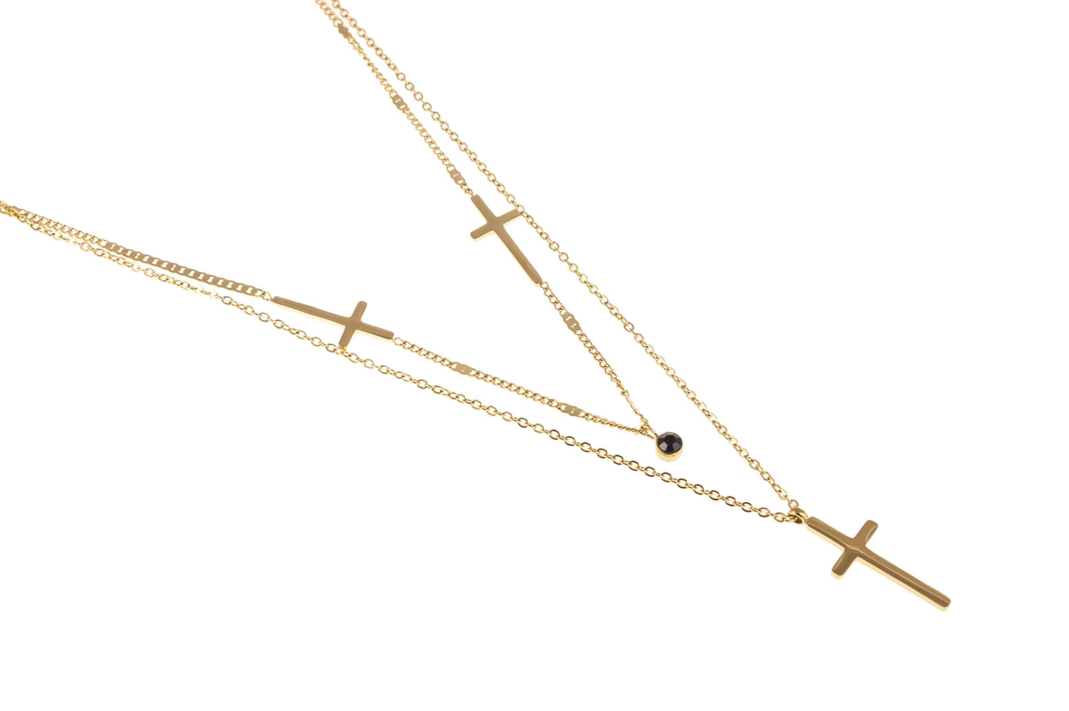 Elegancki złoty naszyjnik z krzyżykami i czarnym dżetem