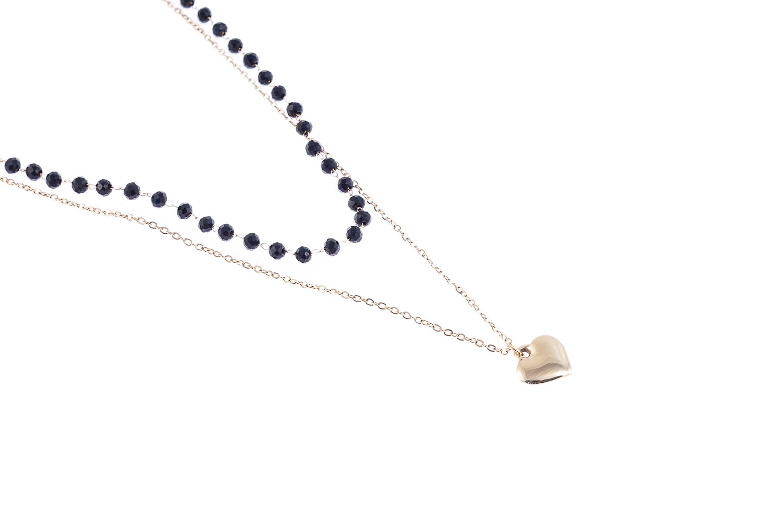 Elegancki, złoty łańcuszek z uroczą przywieszką w kształcie serduszka. Naszyjnik ozdobiny jest szlifowanymi, czarnymi koralikami.Wymiary naszyjnika: