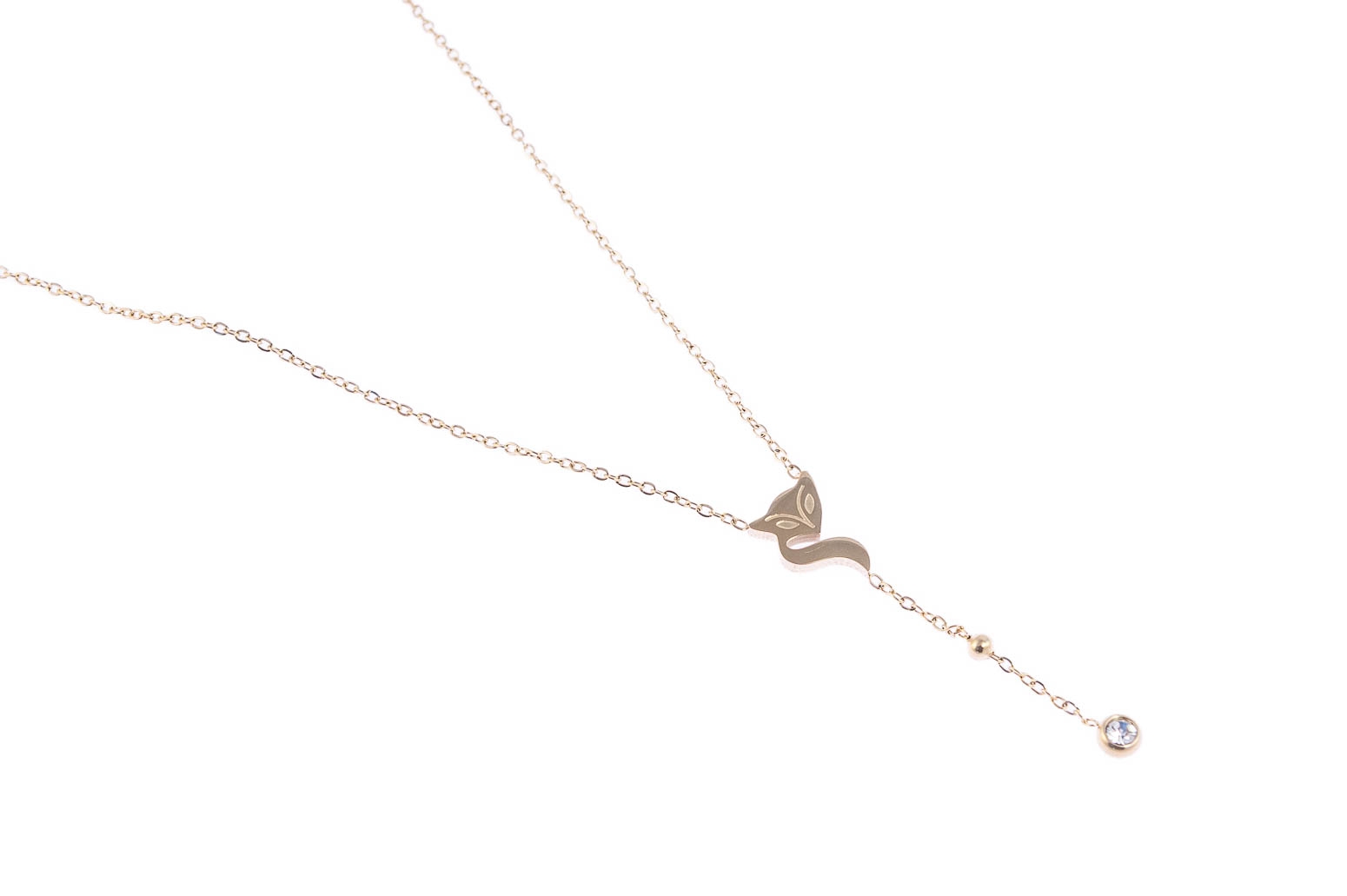 Elegancki, złoty łańcuszek z uroczą przywieszką w kształcie liska, ozdobioną pięknie mieniącym się dżetem.Wymiary naszyjnika: