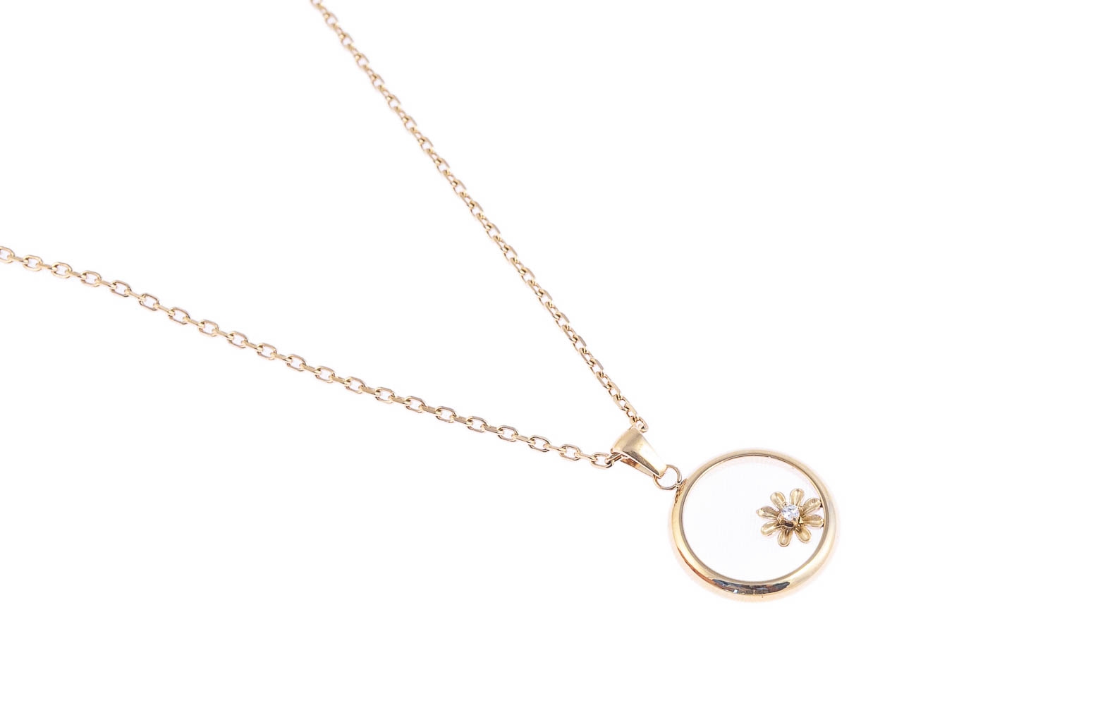 Elegancki, złoty łańcuszek z uroczą przywieszką, ozdobioną pięknie mieniącym się dżetem.Wymiary naszyjnika: