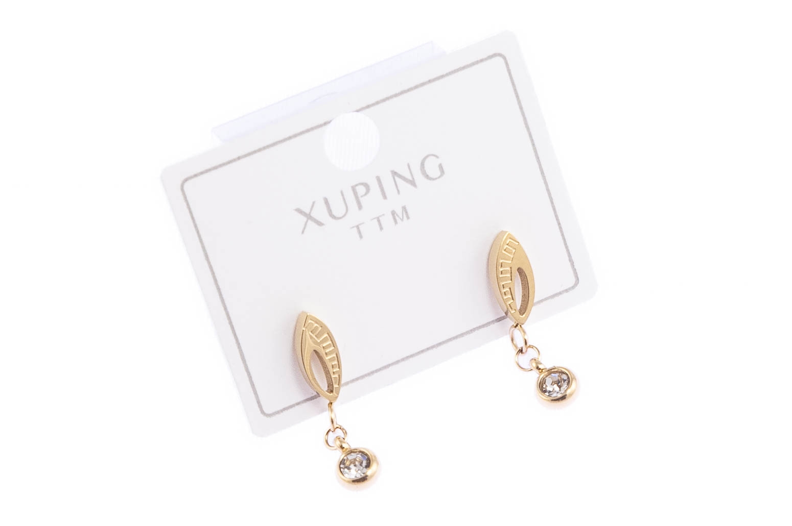 Eleganckie kolczyki w kształcie łezki, ozdobione szlifowanymi kamieniami. Kolczyki są w kolorze złotym.