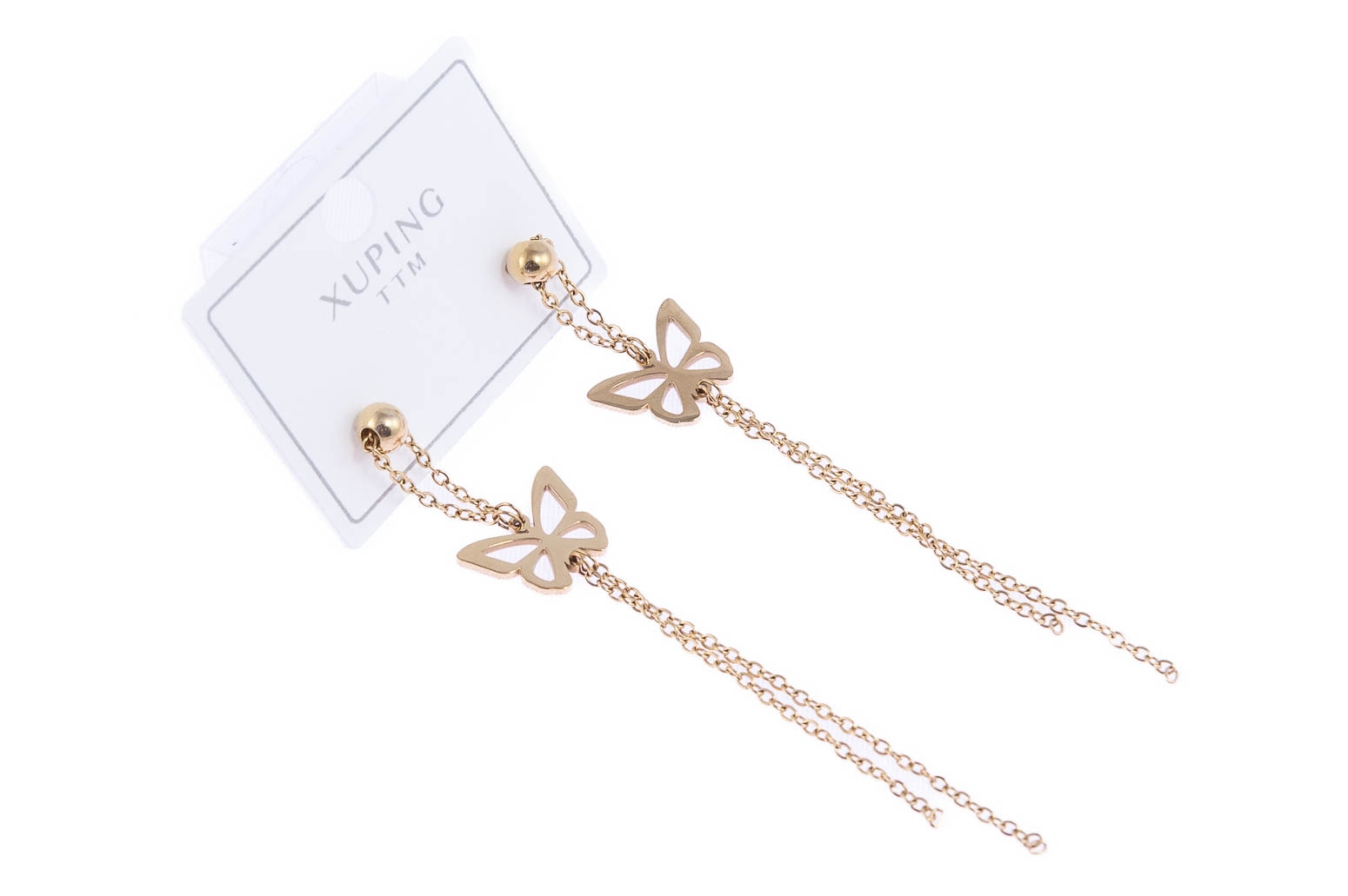Eleganckie wiszące, złote kolczyki ozdobione motylkami.