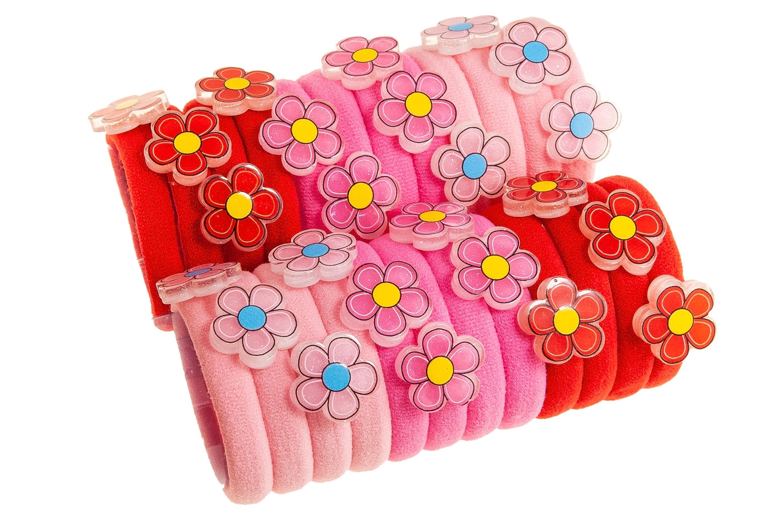 Klasyczne gumki do włosów z uroczą ozdobą w kształcie kwiatka.