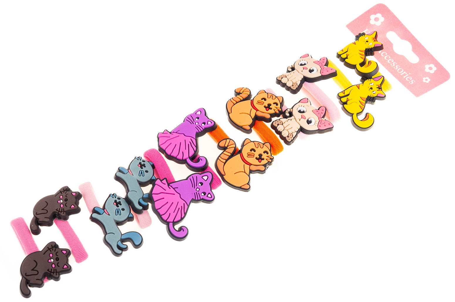 Klasyczne gumki do włosów z uroczymi ozdobami w kształcie kotów.Zestaw składa się z sześciu kolorów.