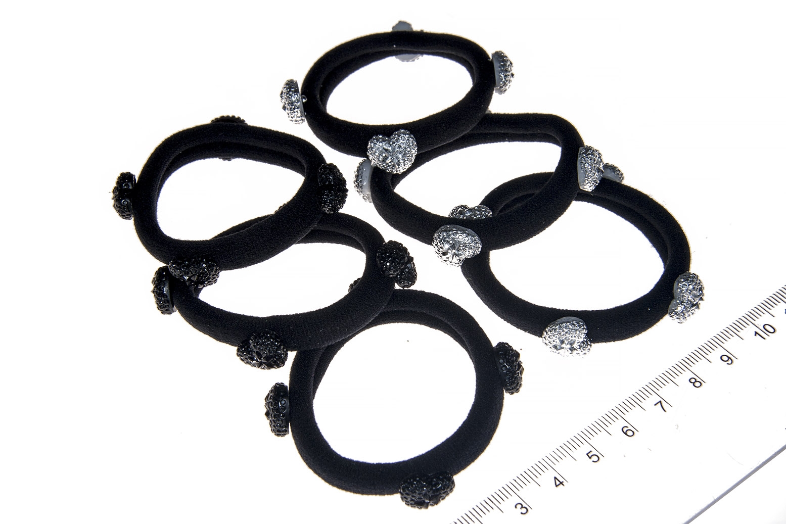 Czarne gumki do włosów z ozdobą w kształcie srebrnego i czarnego serca.