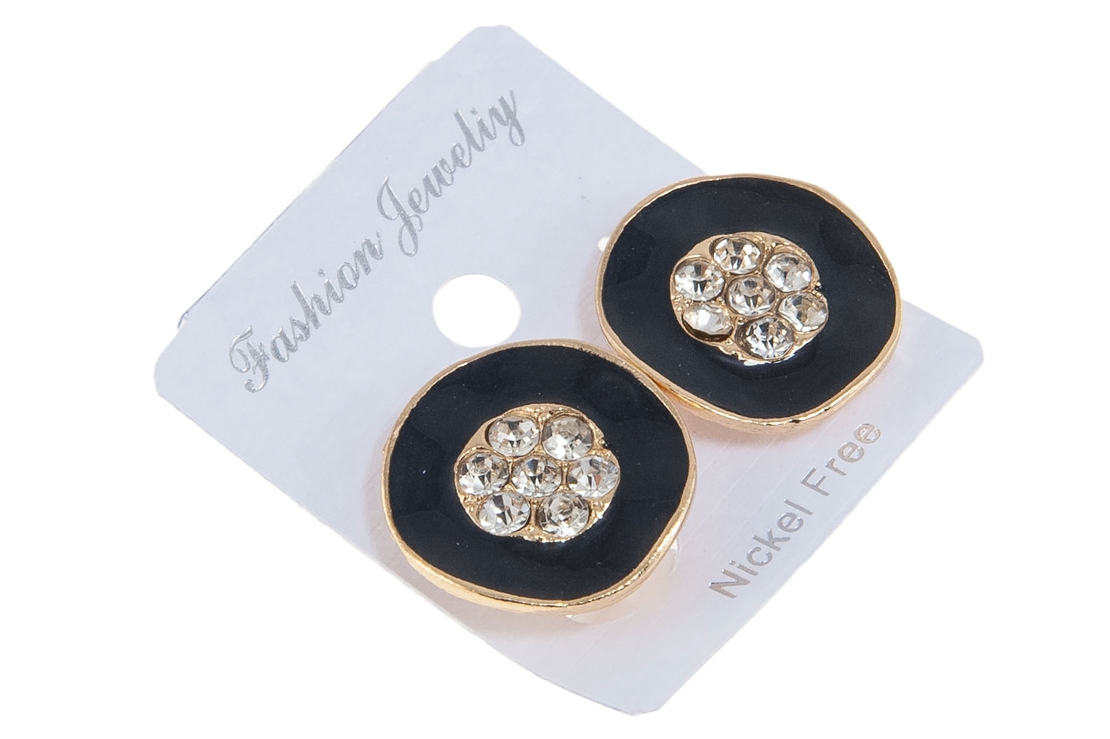 Eleganckie klipsy wykonane z trwałego metalu, ozdobione szlifowanymi kamieniami i czarną emalią. Dodadzą elegancji każdej kobiecie.Kolor: Czarny.