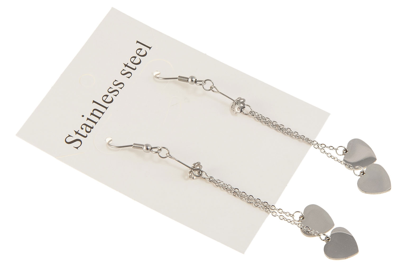 Eleganckie wiszące, srebrne kolczyki z ozdobnymi przywieszkami w kształcie serc.
