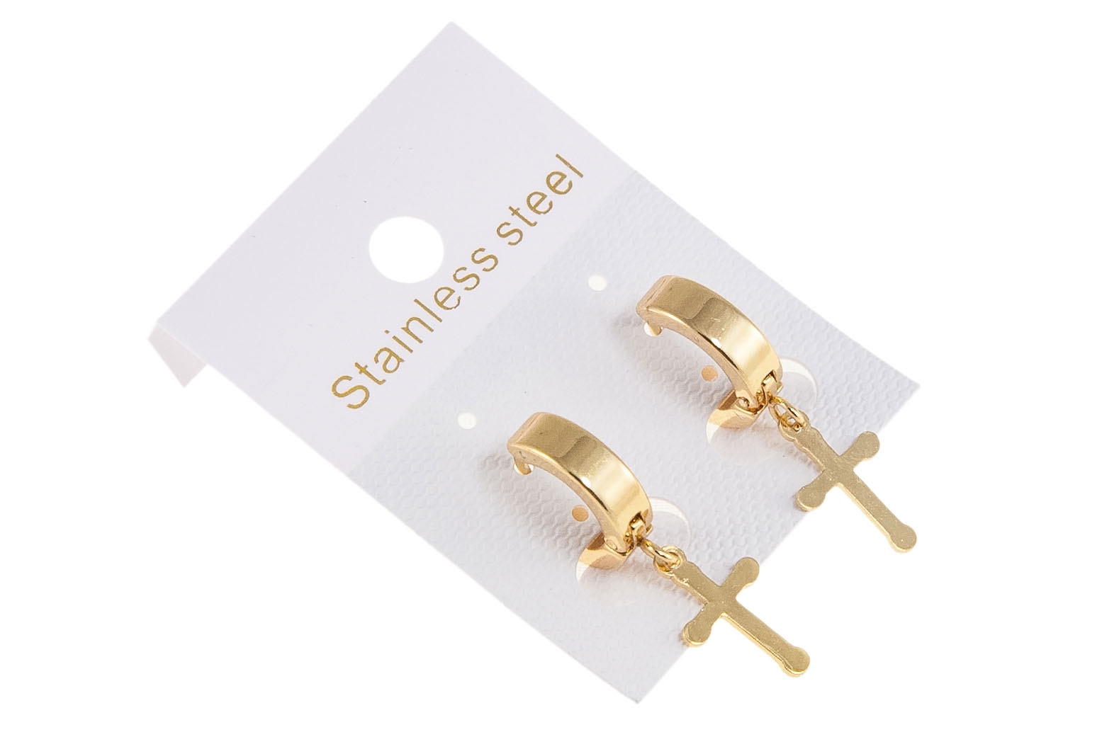 Eleganckie wiszące, złote kolczyki z ozdobną przywieszką w kształcie krzyża.
