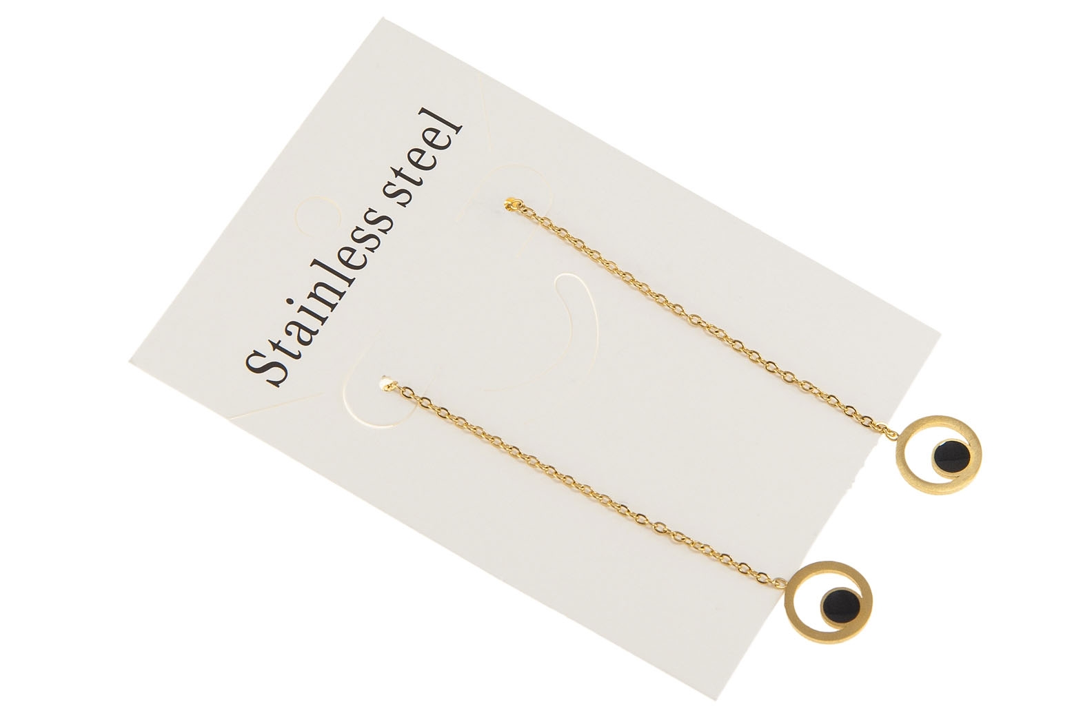Eleganckie wiszące, złote kolczyki z ozdobną przywieszką w kształcie koła z czaeną emalią.
