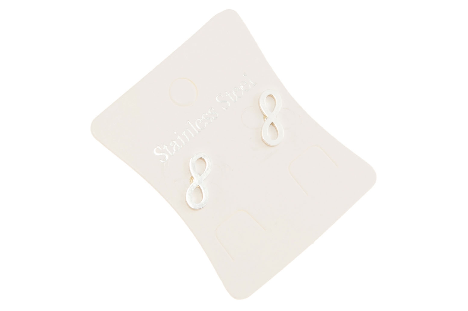 Eleganckie, srebrne kolczyki w kształcie znaku nieskończoności.