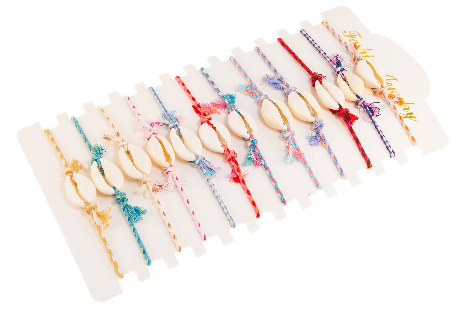 Bransoletki składające się ze plecionych, kolorowych sznurków i muszelek.Bransoletka posiada regulację.
