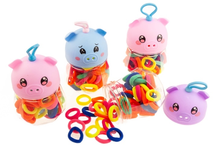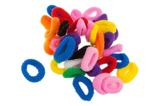 Zestaw małych, kolorowych gumek. Gumki są wytrzymałe i dobrze trzymają włosy.