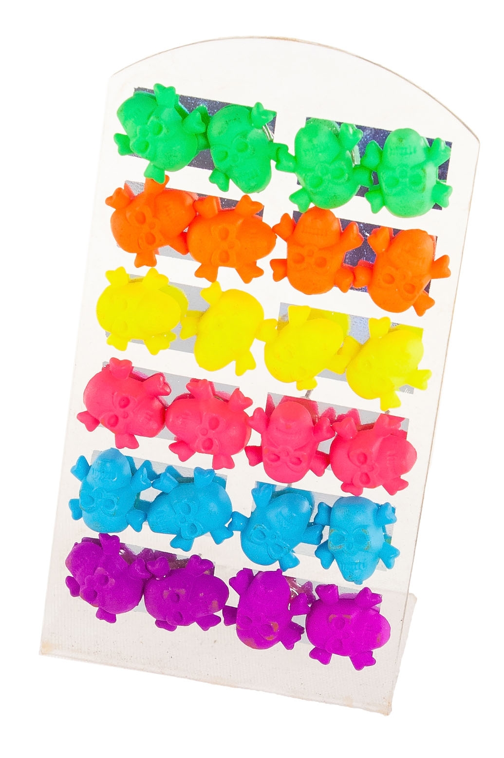 Kolorowe kolczyki w kształcie czaszek.Zestaw składa się z sześciu kolorów: żółty, pomarańczowy, zielony, filoetowy, niebieki i różowy.