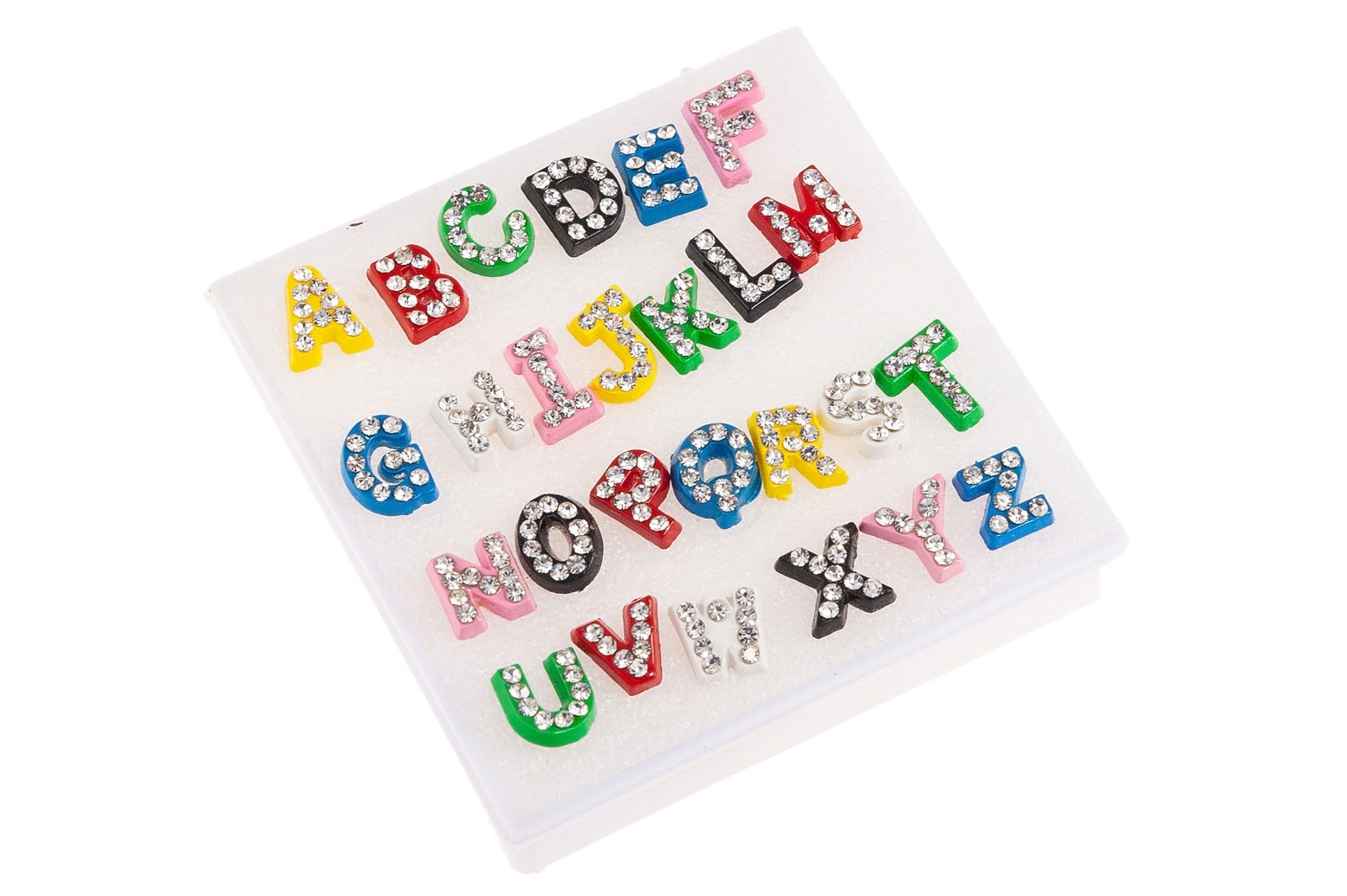 Kolorowe kolczyki w kształcie literek, ozdobione szlifowanymi kamieniami.Kolczyki umieszczone w plastikowym pudełeczku.