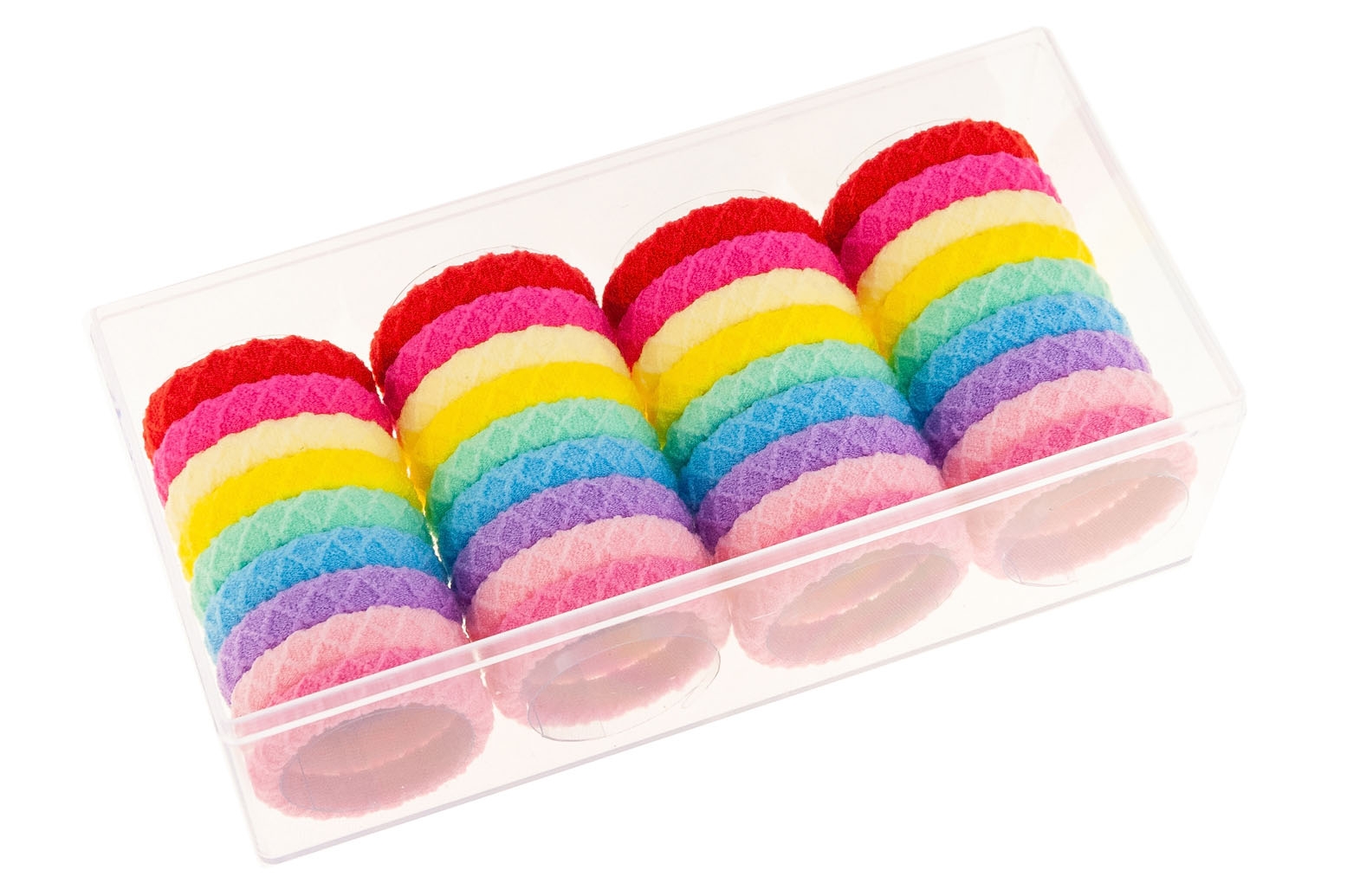 Małe gumki do włosów, są wytrzymałe i dobrze trzymają włosy.Zestaw składa się z dziewięciu kolorów: czerwony, pomarańcz, żółty, beż, zieleń, niebieski, fiolet i róż.