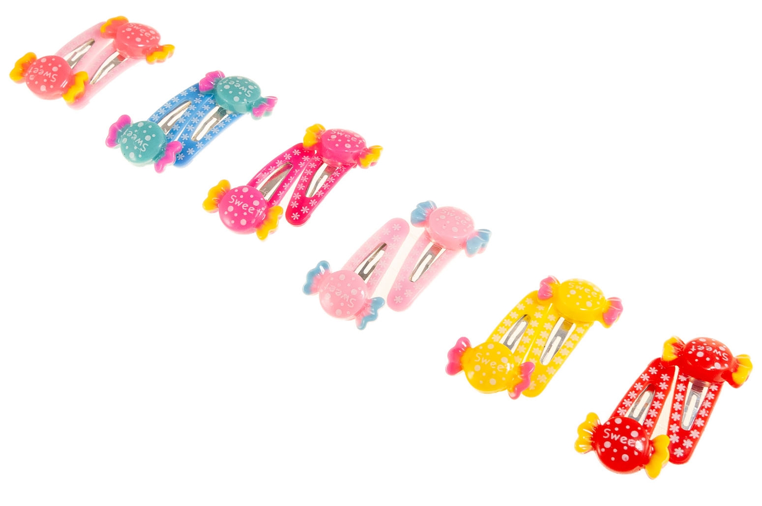 Klasyczne spinki do włosów. Spinki są ozdobiene kolorowymi cukierkami.