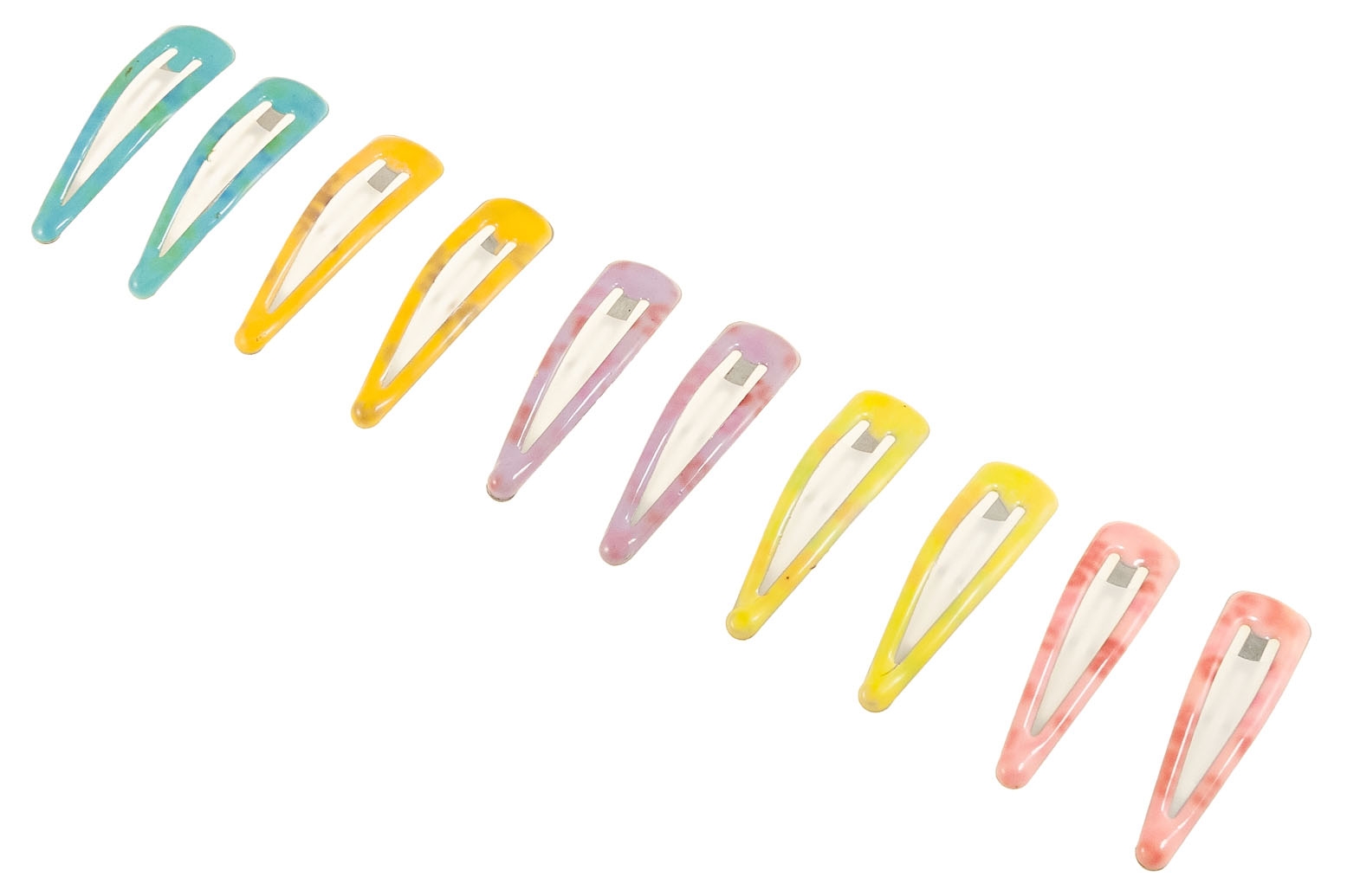 Klasyczne spinki do włosów, wykonane z metalu. Spinki są ozdobiene kolorową emalią.Zestaw składa się z pięciu kolorów: różowy, żółty, fioletowy, pomarańczowy i niebieski.