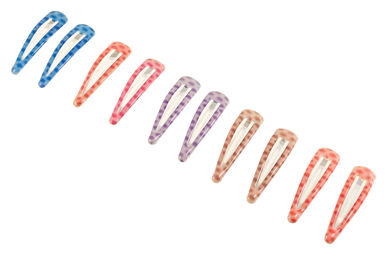 Klasyczne spinki do włosów, wykonane z metalu. Spinki są ozdobiene kolorową emalią.Zestaw składa się z pięciu kolorów: różowy, czerwonym, fioletowy, brązowym i niebieski.